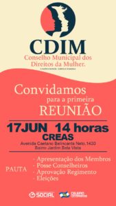 O mandato dos membros do CDIM será de 02 (dois) anos, permitida recondução conforme o art. 4º §1º da Lei Municipal. O registro das Entidades da Sociedade Civil Organizada interessadas em participar do Conselho Municipal dos Direitos da Mulher – CDIM, deverão ser encaminhados até o dia 10 de junho de 2019 para a Secretaria de Assistência Social.
