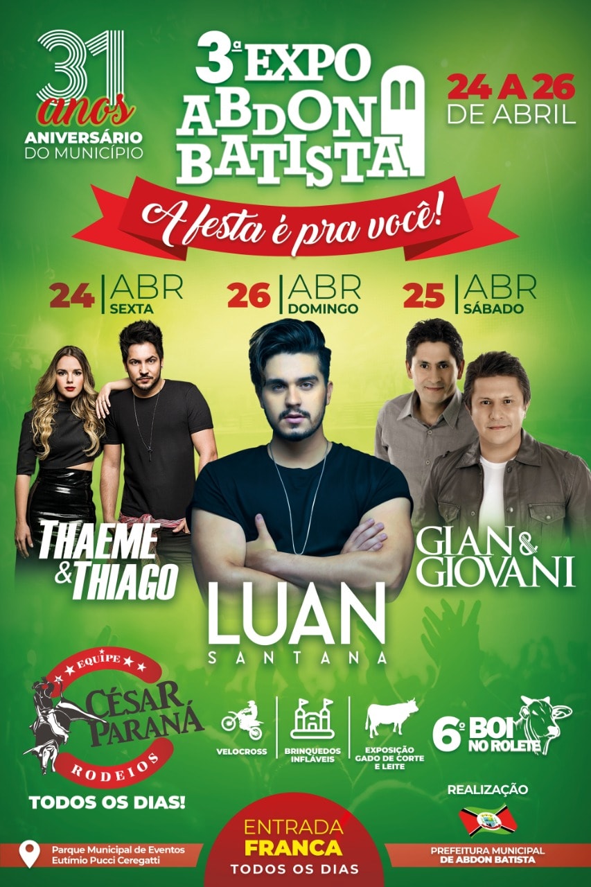 A festa irá acontecer durante três dias, sendo anunciado para dia 24 de abril, (Sexta) o Show com Thaeme e Thiago, Sábado (25), Show com Gian e Giovani e Domingo (26), Luan Santana.