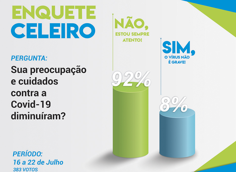 Há seis meses o mundo se viu abalado pela pandemia provocada pelo novo Coronavírus. No início tudo era assustador e a população tinha medo até de se mexer para não se expor ao vírus. Álcool em gel e máscara viraram nossos principais acessórios do dia a dia. As ruas ficaram desertas e os cumprimentos eram dados a distância, no máximo um toque de cotovelos. Passado esse tempo qual o pensamento das pessoas? Acabou o medo e os cuidados? Para saber a opinião dos camponovenes o jornal ‘O Celeiro’, lançou uma enquete querendo saber se a atenção diminuiu ao longo desse semestre. Dos 383 votos, 92% afirmam que a proteção não diminuiu e que continuam atentos a doença, porém 8% responderam que diminuíram sim os cuidados, pois consideram o vírus não tão grave. Felizmente a maioria mostra que se preocupa e atua de forma responsável, mas a minoria que desconsidera a gravidade da doença causa um alerta, pois essas mesmas pessoas que não consideram o vírus grave podem colocar a si e a outros em risco.