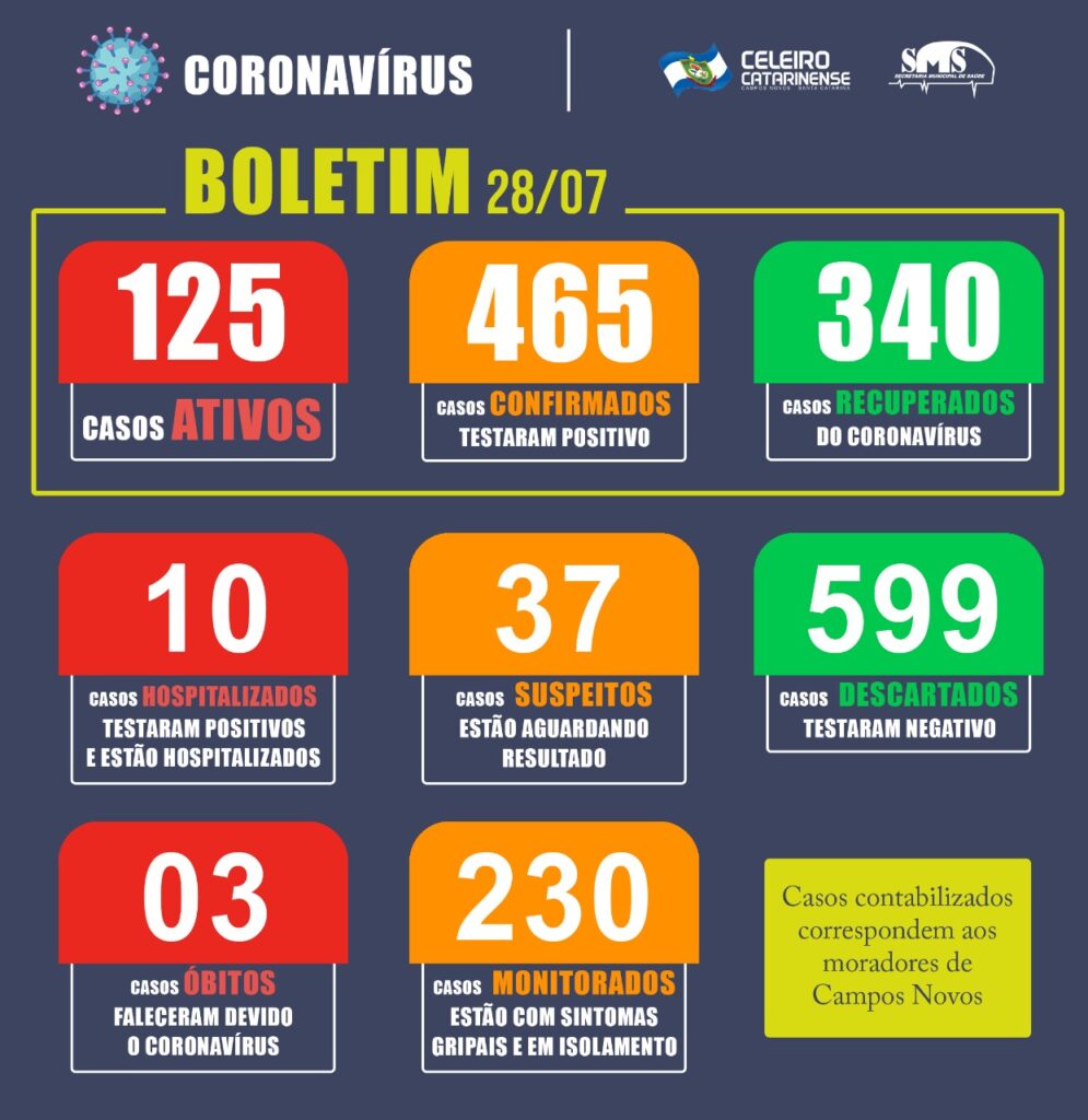 Ainda de acordo com o Boletim Covid-19 desta terça-feira, 28/07, Campos Novos possui 37 casos suspeitos, pacientes que aguardam resultado do exame enviado ao LACEN; 230 pessoas que apresentam quadro gripal e estão em monitoramento; além de 10 moradores de Campos Novos hospitalizados, sendo 06 no Hospital Dr. José Athánázio, 01 no HUST de Joaçaba, 01 no Hospital Hélio Anjos Ortiz em Curitibanos e 02 do Hospital Maicé de Caçador.