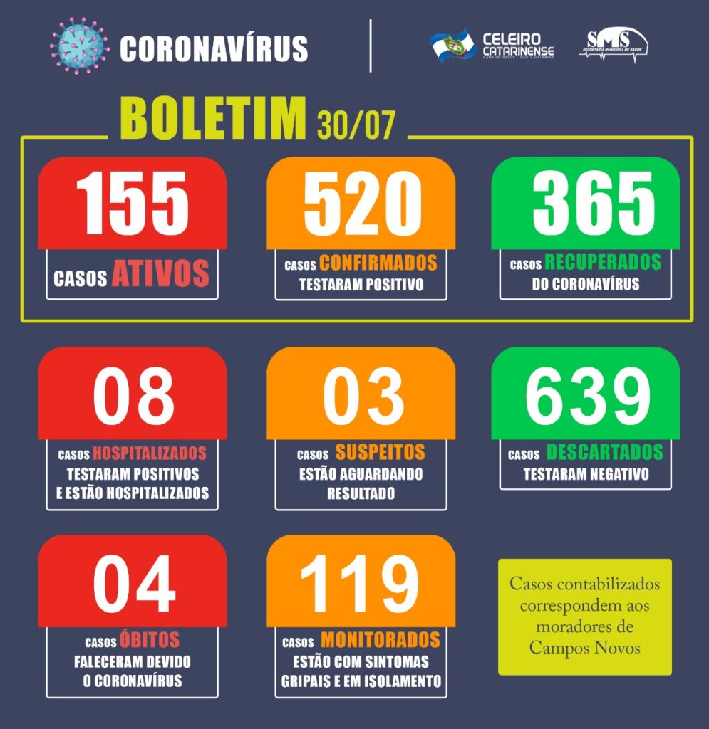 Ainda de acordo com as atualizações do Boletim do Covid-19 divulgado no início da noite desta quinta-feira, 30/07, são 520 casos confirmados, destes, 365 considerados recuperados, ou seja, são 155 ativos para a doença. Os casos suspeitos somam apenas 03, os descartados 639, enquanto os casos em monitoramento totalizam 119.