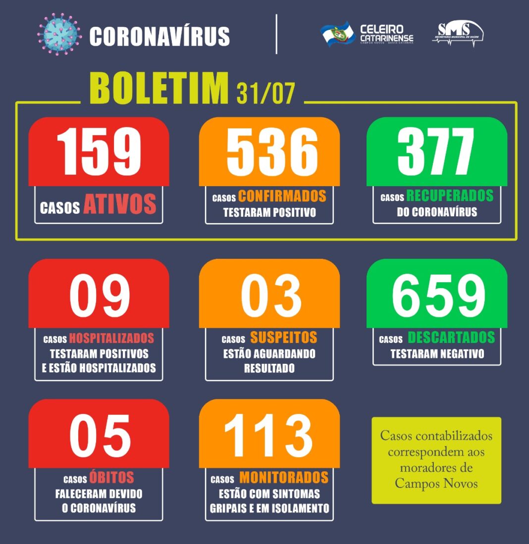 O Boletim Covid-19 desta sexta-feira, 31/07, traz a confirmação da quinta morte relacionada ao Coronavírus, e uma crescente no número de casos confirmados para a doença. De acordo com os dados da Secretaria Municipal de Saúde, são 536 pacientes diagnosticados com a doença, destes 159 ativos, ou seja, 377 já são considerados recuperados.