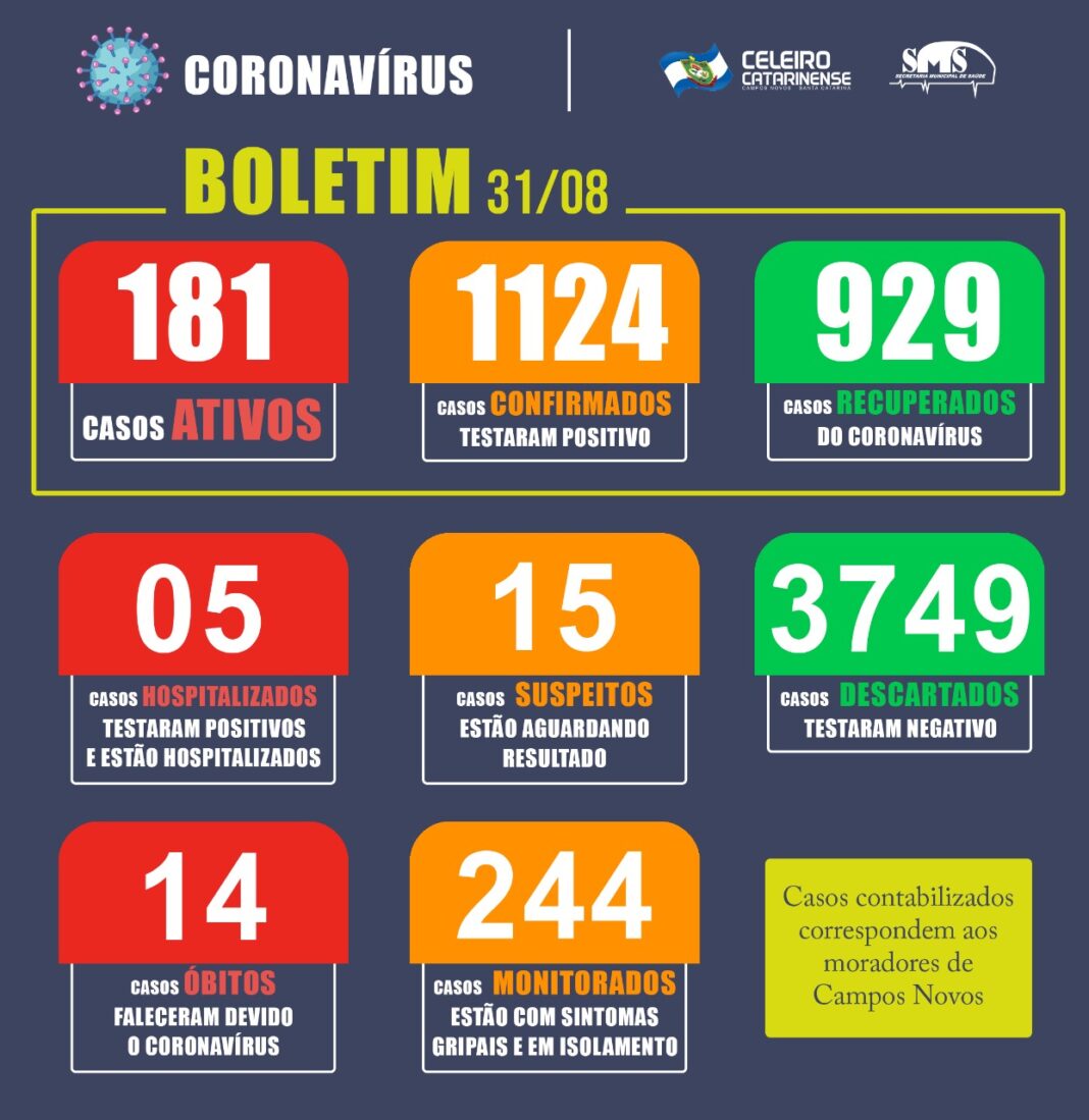 Atualmente são 05 moradores de Campos Novos hospitalizados, sendo que 03 estão internados no Hospital Dr. José Athanázio, 01 no Hospital Divino Salvador em Videira e 01 no Hospital São Francisco em Concórdia. O município também contabiliza 14 óbitos por Coronavírus.