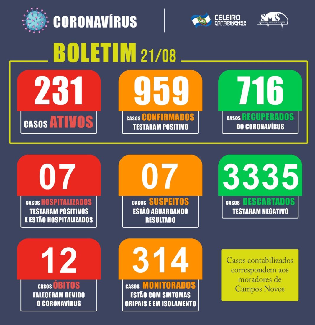 Também conforme o boletim, atualmente são 231 pessoas ativas com o vírus, ou seja, 716 das 959 pessoas que contraíram o vírus já são consideradas recuperadas. Pacientes que apresentam quadro gripal leve e estão em monitoramento somam 314 e moradores de Campos Novos hospitalizados não sofreu alterações nas últimas 24 horas e continua sendo 07.