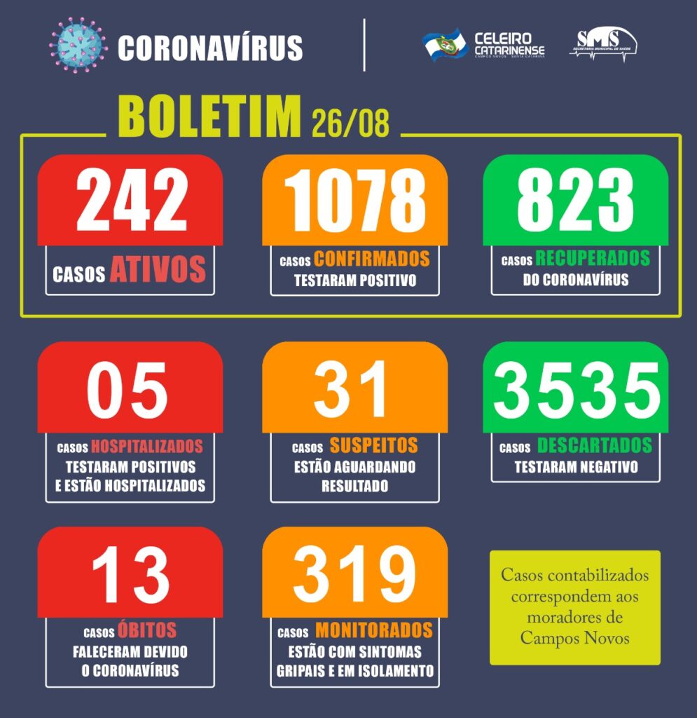 Ainda conforme o Boletim Covid-19 desta quarta-feira, 26/08, o número de testes que deram negativos e são considerados descartados somam 3535. Pacientes que tiveram coletas enviadas ao LACEN e aguardam resultado somam 31 e pacientes que apresentam sinais gripais leves e estão em monitoramento totalizam 319.