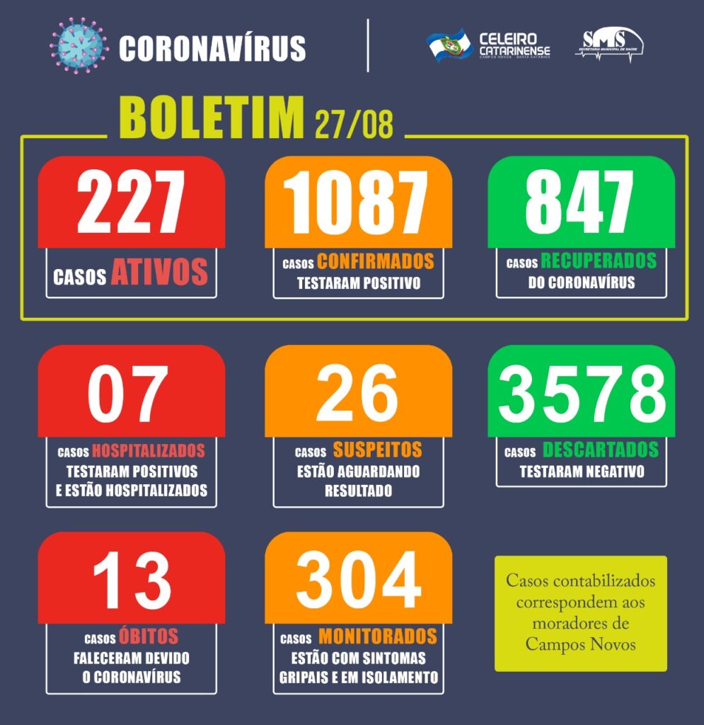 Nas últimas 24 horas o município de Campos Novos registrou 09 novos casos confirmados para Coronavírus, em contrapartida, 24 pacientes diagnosticados com a doença passaram a ser considerados recuperados neste mesmo período, desta forma, o número de moradores de Campos Novos com o vírus ativo passou de 242 para 227, conforme o Boletim Covid-19 desta quinta-feira, 27/08.