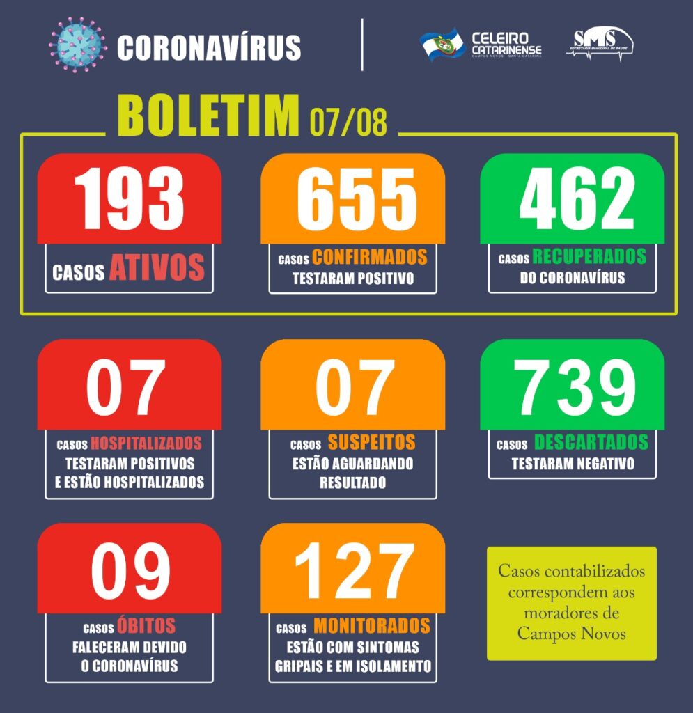 Conforme os dados divulgados nesta sexta, Campos Novos possui atualmente 193 pacientes ativos para a doença, e um total de 655 casos confirmados e 462 considerados recuperados para o Covid-19. Pacientes que aguardam resultado de exames enviados ao LACEN, somam 07, enquanto 127 pessoas seguem em monitoramento com quadro gripal leve. Testes realizados que deram negativo totalizam 739.