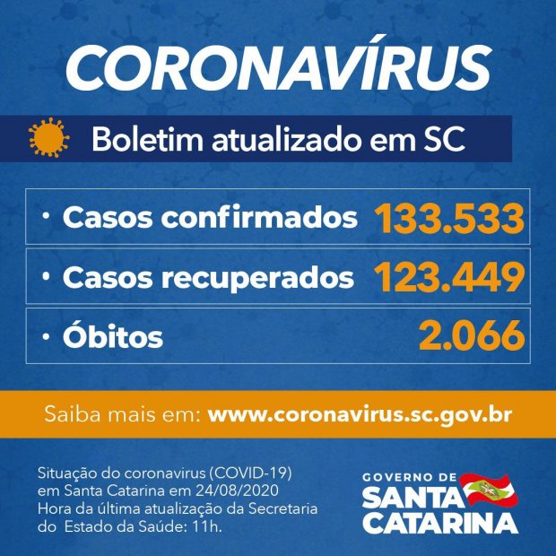 O Governo de Santa Catarina informou que há 133.533 pacientes com teste positivo para Covid-19, sendo que 123.449 se recuperaram e 8.018 estão em acompanhamento. O balanço foi divulgado nesta segunda-feira, 24. Desde o início da pandemia, 2.066 óbitos foram causados pelo coronavírus. Com isso, a taxa de letalidade é de 1,55%.