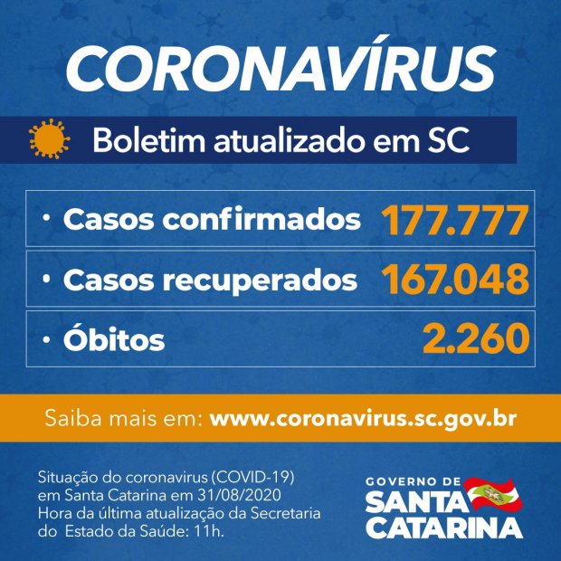 Santa Catarina já registrou 177.777 pacientes com teste positivo para Covid-19, sendo que 167.048 se recuperaram e 8.469 estão em acompanhamento. O dado foi divulgado nesta segunda-feira, 31. O coronavírus causou 2.260 óbitos no estado até agora. A taxa de letalidade é de 1,27%.