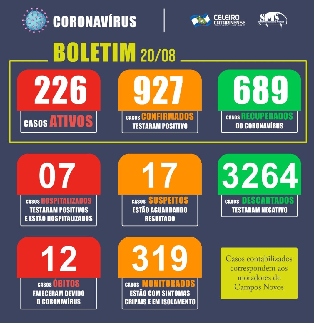 Quanto aos moradores de Campos Novos confirmados para a doença que se encontram hospitalizados, o total é de 07, sendo que 03 deles estão internados no Hospital Dr. José Athanázio, 01 no Hospital Maicé de Caçador, 01 no Hospital Hélio Anjos Ortiz, 01 no Hospital Divino Salvador de Videira e 01 no Hospital São Cristóvão de Concórdia.