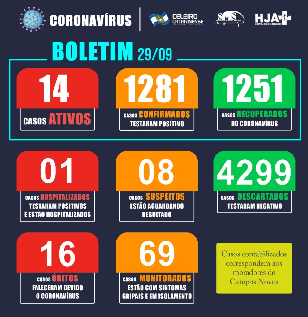 O Boletim Covid-19 desta terça-feira, 29/09, informa que o município de Campos Novos possui no momento 14 pacientes ativos para o Coronavírus. Ao todo são 1281 casos confirmados para a doença, sendo que deste total, 1251 já são considerados recuperados. Existe ainda, 08 casos suspeitos de pacientes que tiveram material enviado ao LACEN e aguardam resultado.
