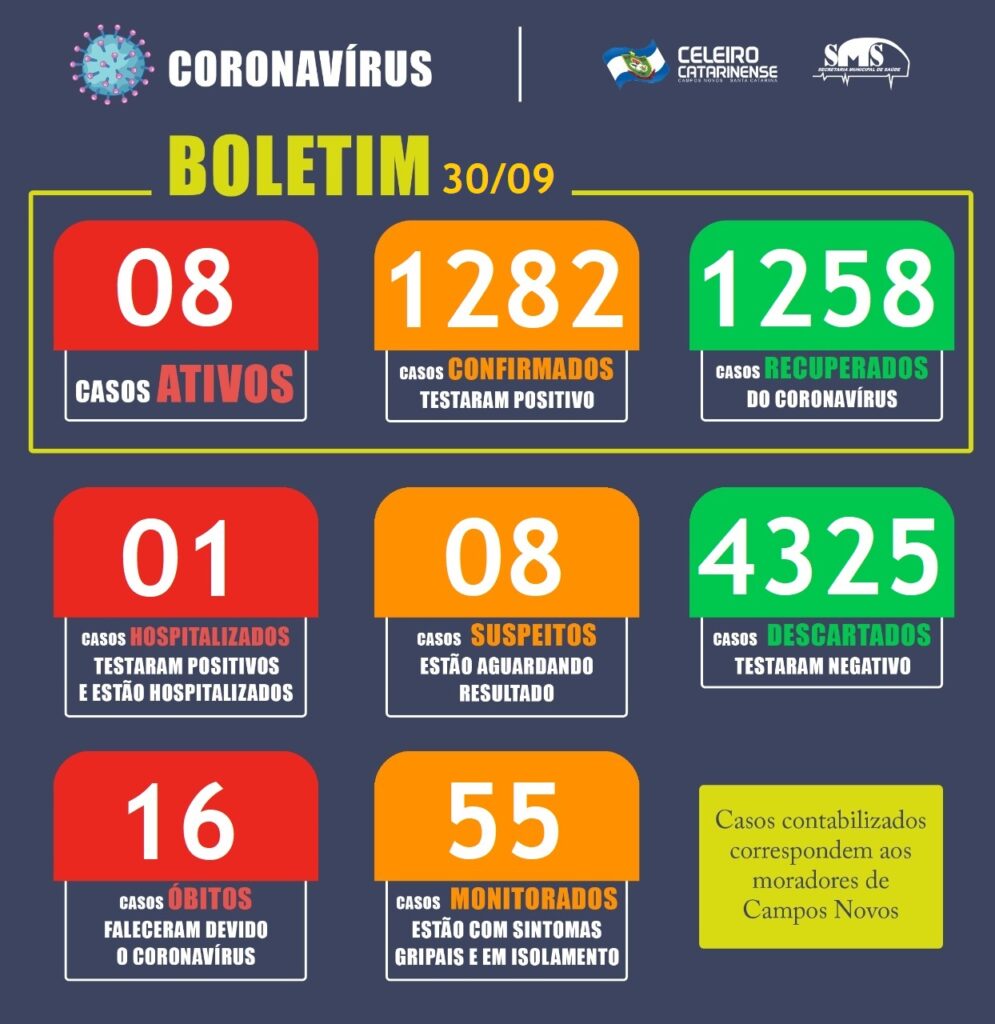 Os últimos boletins Covid-19 publicados pelo Município de Campos Novos dão sérios indícios que o momento mais crítico vivido durante a Pandemia já ficou para trás. Conforme a última atualização divulgada pelo setor de saúde nesta quarta-feira, 30/09, o município possui “apenas” 08 casos ativos para Coronavírus. É o menor índice apresentado desde o dia 15 de junho, na ocasião o município também contabilizava 08 casos ativos para a doença.