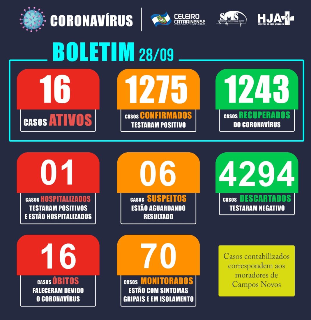 Um novo Boletim Covid-19 foi divulgado na tarde desta segunda-feira, 28/09, onde traz a informação de 02 novos casos confirmados de Coronavírus no município, dessa forma, o número total de testes positivados passa a ser 1.275, embora, 1.243 já são considerados recuperados. A considerar os 16 óbitos relacionados à doença até o momento, Campos Novos possui 16 pacientes ativos para o vírus.