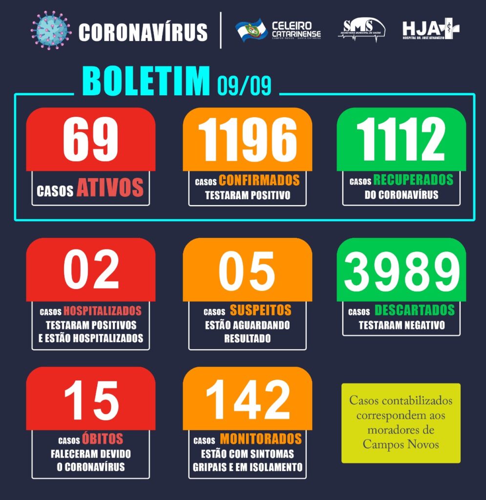 O Boletim Covid-19 desta quarta-feira, 09/09, trouxe uma situação que há pelo menos uma semana não se via em Campos Novos: um aumento nos casos ativos para o Coronavírus. Nas últimas 24 horas o munícipio contabilizou 21 novos casos positivados para a doença, alcançando o total de 1.196 casos confirmados para o Covid-19 desde o início da pandemia. Os pacientes considerados recuperados totalizam até o momento 1.112, desta maneira, levando ainda em consideração os 15 óbitos relacionados ao Coronavírus no município, os casos ativos fecharam em 69 nesta quarta.