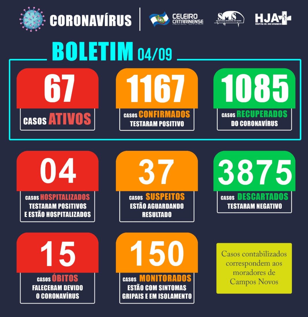 Moradores de Campos Novos hospitalizados somam 04, três deles estão internados no Hospital Dr. José Athanázio e 01 no Hospital Divino Salvador de Videira. O número total de óbitos até o momento é de 15.