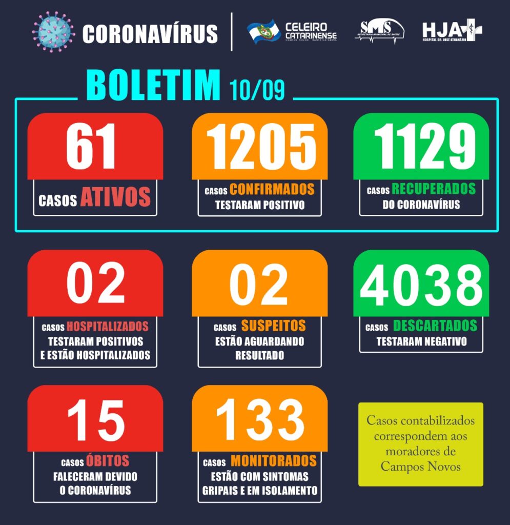 Outra informação que merece destaque é o número de casos ativos no município que, conforme o Boletim desta quinta-feira, 10/09, caiu para 61, muito em decorrência dos pacientes que já são considerados recuperados, os quais somam 1.129. Ainda de acordo com informações do setor de Saúde, existem 133 pessoas em monitoramento em Campos Novos, além de 02 moradores do município hospitalizados, um deles está internado no Hospital Dr. José Athanázio e o outro no Hospital Hélio dos Anjos Ortiz em Curitibanos.