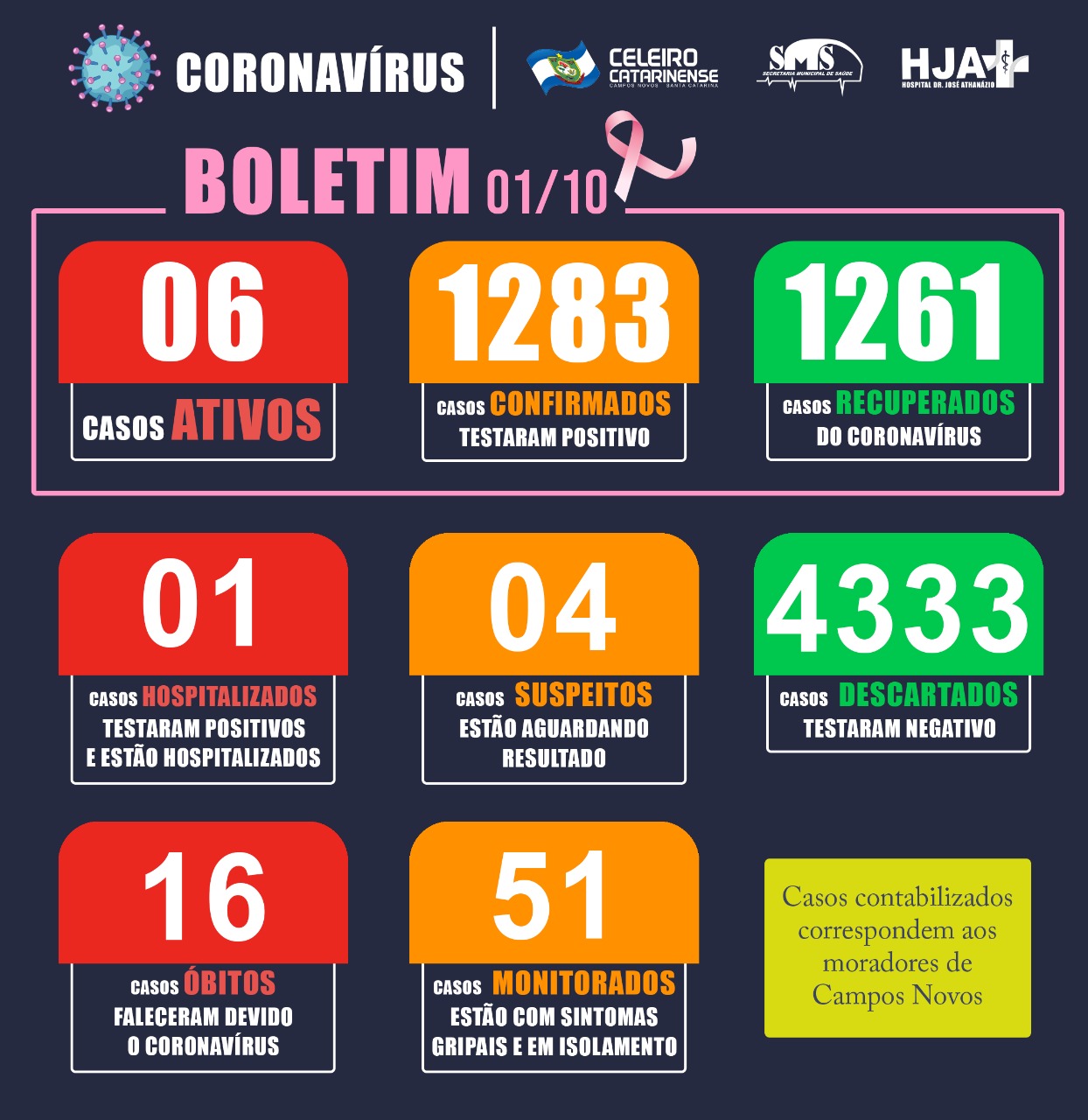 A população camponovense pode dizer que o seu município possui literalmente meia dúzia de casos ativos para Coronavírus. A confirmação veio na tarde desta quinta-feira, 01/10, por meio do Boletim Covid-19, após a confirmação de mais um caso positivo para a doença e mais três recuperados. Desta maneira, em números totais, o município que já registrou 16 óbitos relacionados ao Covid-19, totaliza 1283 casos confirmados, destes, 1261 já são considerados recuperados.