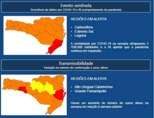 A publicação desta semana coloca as regiões Carbonífera, Extremo-Sul e Laguna em alerta pelo aumento no número de óbitos. Além disso, aponta que o Alto Uruguai Catarinense e Grande Florianópolis registraram elevação no número de casos ativos.