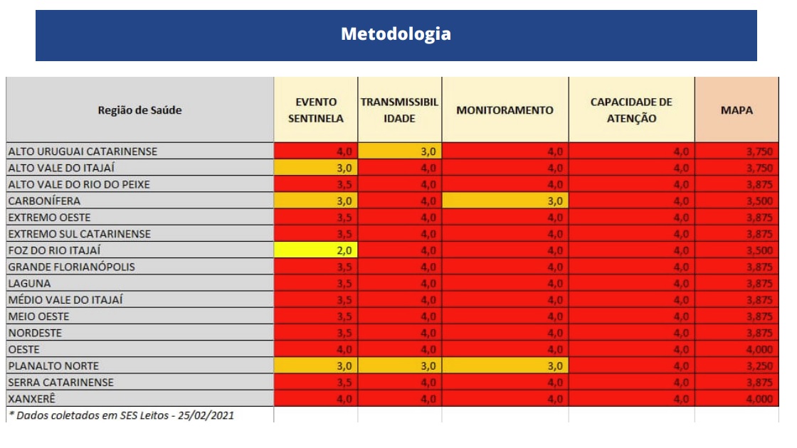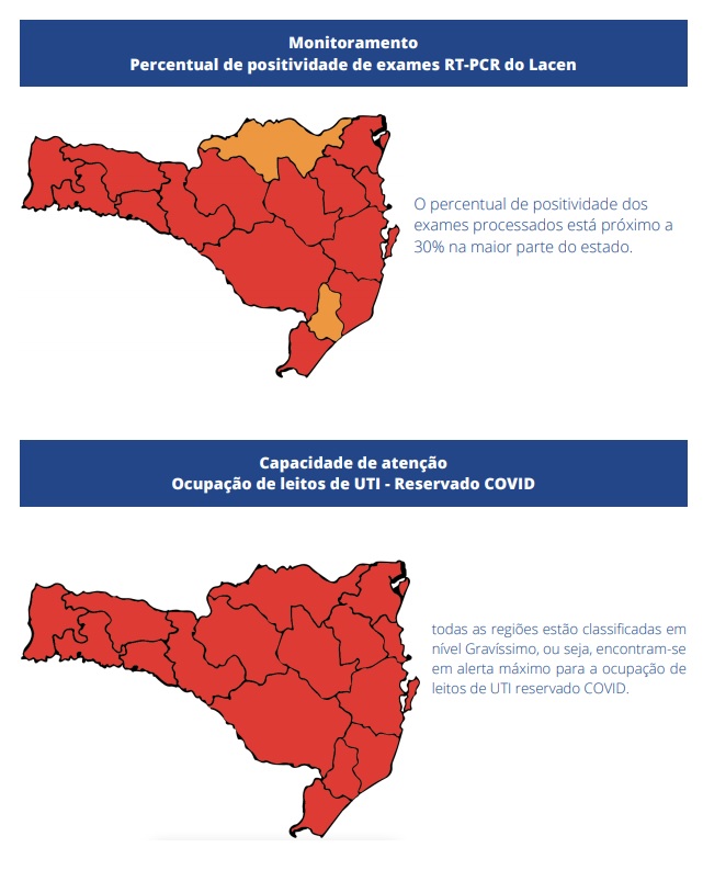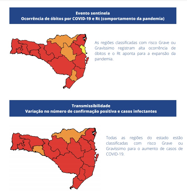 Em relação aos dados divulgados na semana passada, a região Carbonífera apresentou piora no cenário e foi reclassificada da situação Grave (cor laranja) para Gravíssimo.