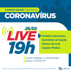Hoje está marcada pela Administração Municipal uma Live às 19h com o Prefeito Zancanaro, a Secretária de Saúde Mayara Serena e o Diretor do Hospital Dr. José Athanázio para avaliação da pandemia.