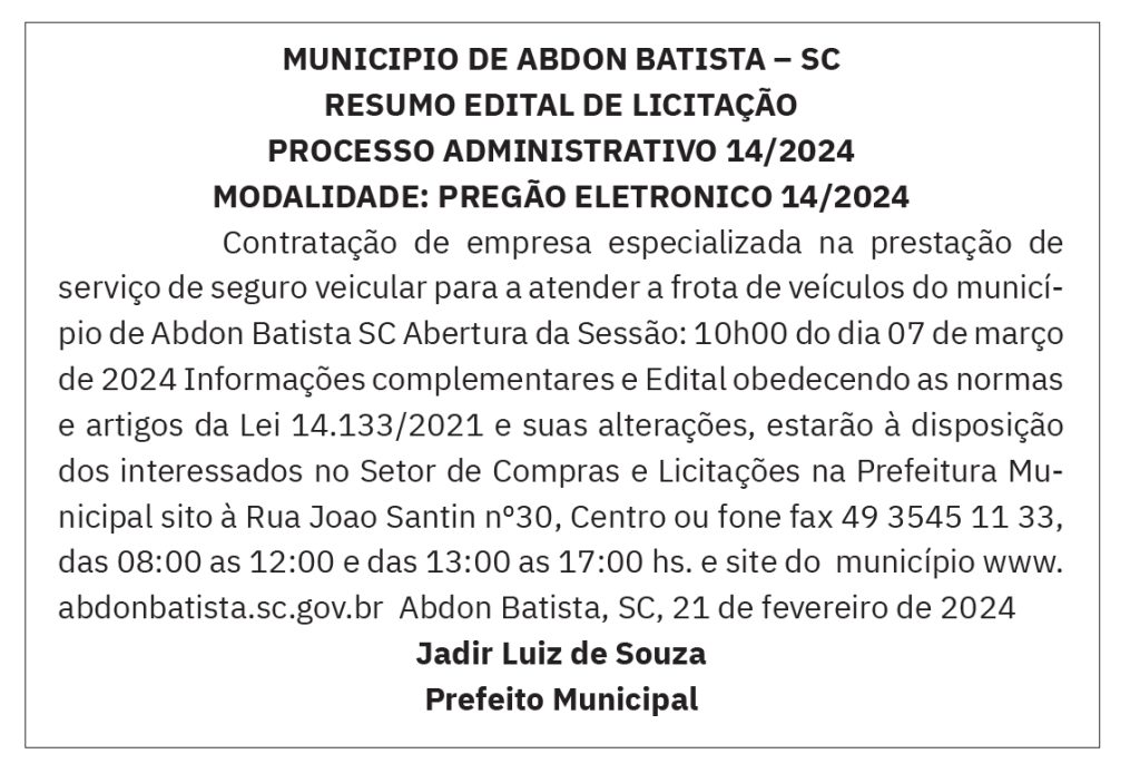 MUNICÍPIO DE ABDON BATISTA – SC – PREGÃO ELECTRÔNICO 14/2024 Redação 2 anos atrás ACESSE O PDL – CLIQUE AQUI
