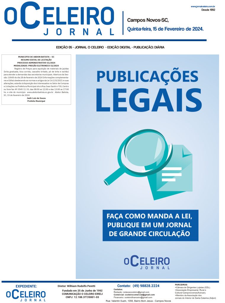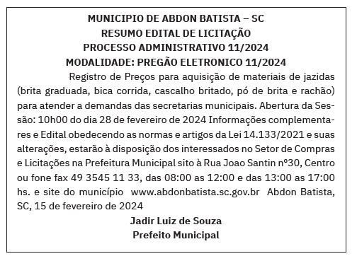MUNICIPIO DE ABDON BATISTA – SC – PREGÃO ELETRONICO 11/2024 Redação 2 anos atrás ACESSE O PDF – CLIQUE AQUI