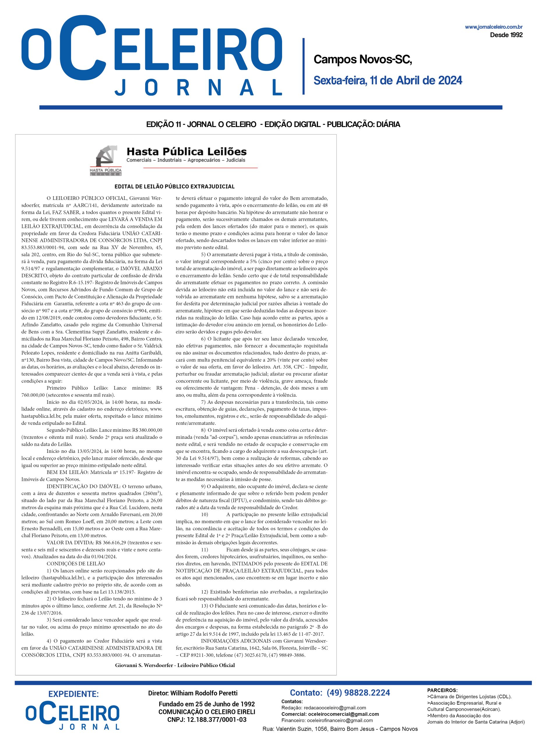 [slideshow_deploy id='63323'] EDITAL – Leilão Público Extrajudicial By Redação 11 abril, 2024 FacebookTwitterPinterestWhatsApp ACESSE O PDF – CLIQUE AQUI Mais lidas na semana Comunidade VAGAS DE EMPREGO – CAMPOS NOVOS 17 abril, 2026 0 A Empresa Cobra Brasil Serviços, Comunicações e Energia,... Destaques Governo anuncia chamamento de cerca de 600 profissionais da Saúde 17 abril, 2026 0 Com a autorização do governador Jorginho Mello, a Secretaria... Comunidade Sol e tardes quentes marcam o fim de semana e o feriado de Tiradentes 17 abril, 2026 0 Manhãs começam mais frias, mas temperaturas sobem ao longo... Destaques Hospital lança Edital de Chamamento de Entidades para Conselho Diretor e Curador 17 abril, 2026 0 O Hospital Dr. José Athanázio, lançou nesta semana o... Agronegócio Santa Catarina bate recorde histórico nas exportações de carnes no 1º trimestre de 2026 17 abril, 2026 0 Santa Catarina registrou desempenho recorde nas exportações de carnes... Notícias relacionadas VAGAS DE EMPREGO – CAMPOS NOVOS Governo anuncia chamamento de cerca de 600 profissionais da Saúde Sol e tardes quentes marcam o fim de semana e o feriado de Tiradentes Hospital lança Edital de Chamamento de Entidades para Conselho Diretor e Curador Santa Catarina bate recorde histórico nas exportações de carnes no 1º trimestre de 2026 Campos Novos céu limpo enter location 20.3 ° C 20.3 ° 20.3 ° 62 % 1.9kmh 0 % sáb 25 ° dom 27 ° seg 29 ° ter 24 ° qua 27 ° Pesquisar Categorias Populares Últimas NotíciasDestaquesComunidadeSaúdeAgronegócioOcorrências Campos NovosCotidiano