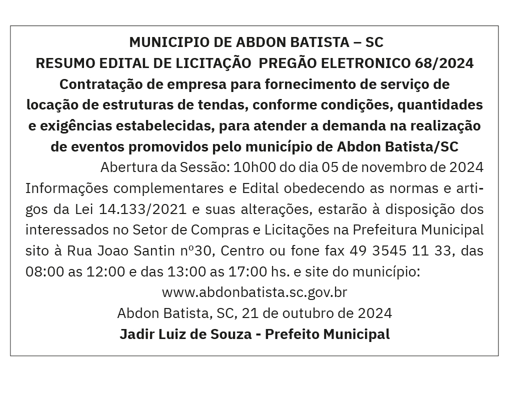 MUNICIPIO DE ABDON BATISTA – SC: PREGÃO ELETRONICO 68/2024