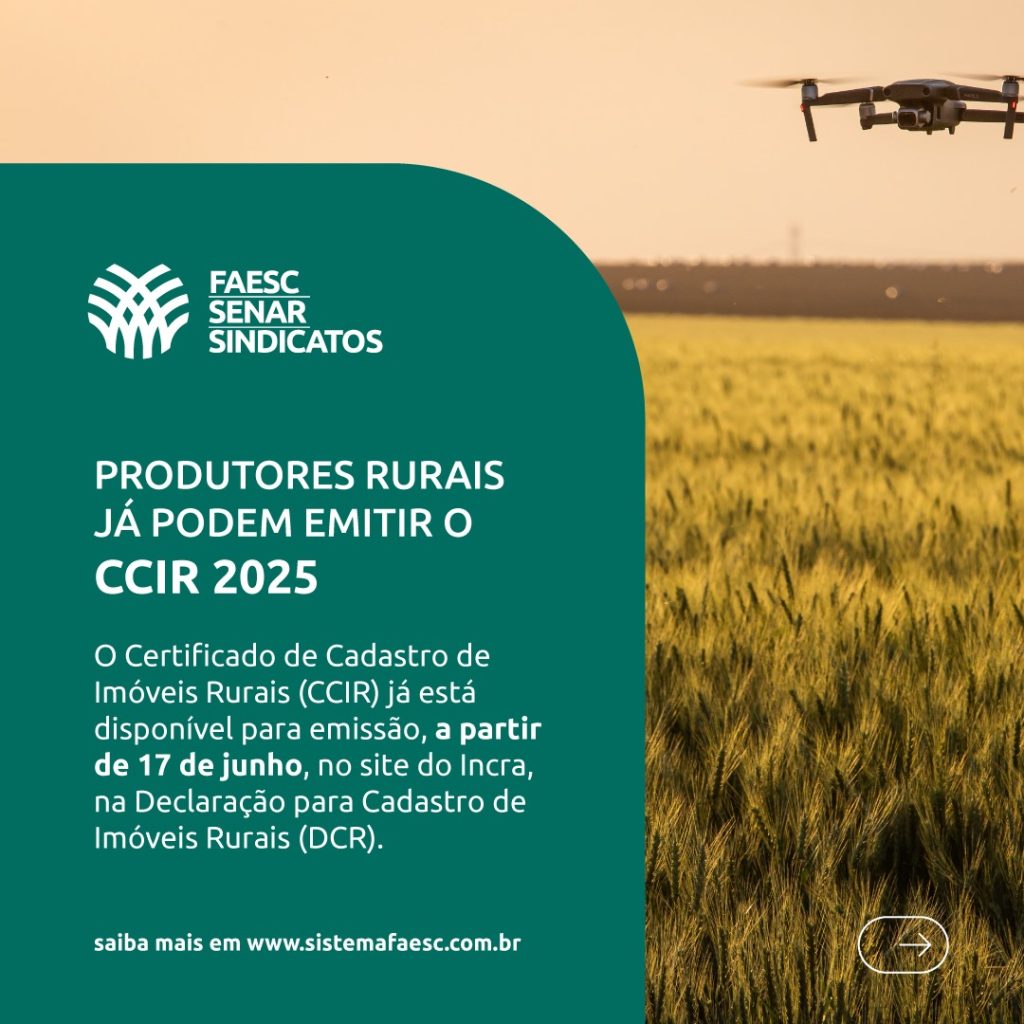 A Federação da Agricultura e Pecuária do Estado de Santa Catarina (Faesc) alerta os proprietários de imóveis rurais sobre a obrigatoriedade da emissão do Certificado de Cadastro de Imóvel Rural (CCIR), referente ao exercício de 2025. Com validade de um ano, o CCIR comprova que a propriedade rural está regularmente cadastrada no Instituto Nacional de Colonização e Reforma Agrária (Incra).