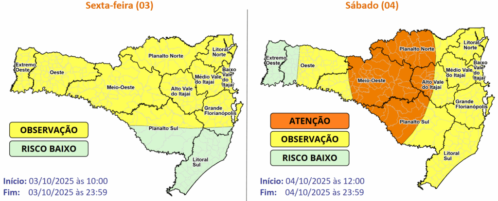 No decorrer desta sexta-feira a circulação marítima mantém a condição para chuva persistente no leste catarinense. A chuva pode vir intensa em alguns momentos, trazendo risco baixo a moderado para ocorrências associadas a alagamentos pontuais. Entre o Grande Oeste, Planaltos e sul catarinense, o aquecimento somado a disponibilidade de umidade, favorecem a ocorrência de temporais isolados, trazendo risco moderado para ocorrências associadas a queda de galhos, danos na rede elétrica e destelhamentos.
