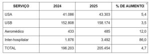De janeiro a dezembro de 2025, foram realizados mais de 43.303 mil atendimentos por USA, 158.174 mil por USB, além de 485 missões aeromédicas e 3.492 mil transportes inter-hospitalares. O Suporte Avançado apresentou aumento de 5,4% em comparação a 2024, enquanto o Suporte Básico teve alta de 3,5%.