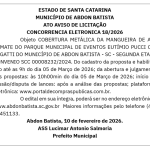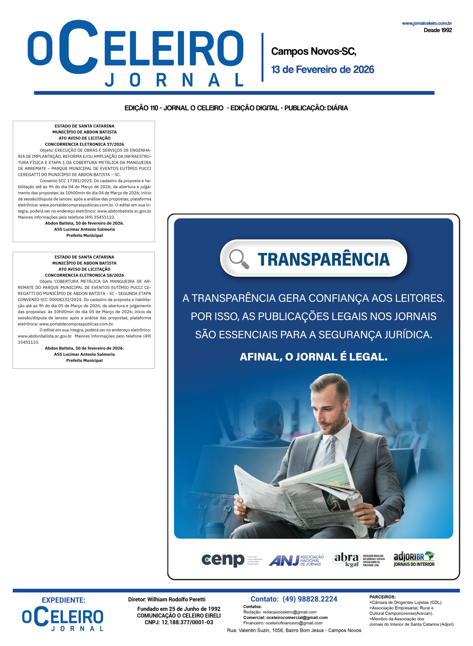 [slideshow_deploy id='63323'] MUNICÍPIO DE ABDON BATISTA/SC – LICITAÇÃO – CONCORRENCIA 17 e 18/2026 By Redação 13 fevereiro, 2026 FacebookTwitterPinterestWhatsApp Mais lidas na semana Comunidade Santa Catarina tem segundo maior crescimento do varejo do país 20 abril, 2026 0 O desempenho catarinense supera com folga a média nacional,... Destaques Saúde amplia acesso à vacina contra o HPV em Santa Catarina 20 abril, 2026 0 A Secretaria de Estado da Saúde de Santa Catarina... Destaques Sicredi aumenta em 15,7% volume liberado para o agro nos primeiros oito meses da Safra 25/26 20 abril, 2026 0 Instituição financeira cooperativa concedeu R$ 48,3 bilhões até fevereiro... Agronegócio SEMAE e OCESC avançam em cooperação para capacitar técnicos sobre o CAR Digital 20 abril, 2026 0 A proposta prevê que a SEMAE ofereça capacitações específicas... Cultura Festa de São João Batista inicia no dia 13 de junho com tradicional Baile de São João 20 abril, 2026 0 A Paróquia São João Batista de Campos Novos, iniciou... Notícias relacionadas ABDON BATISTA/SC – LICITAÇÃO – PREGÃO 43/2026 MUNICÍPIO DE ABDON BATISTA/SC – LICITAÇÃO – PREGÃO 42/2026 ABDON BATISTA – LICITAÇÃO PREGÃO – 36/2026 MUNICÍPIO DE ABDON BATISTA/SC – LICITAÇÃO – PREGÃO 01/2026 ABDON BATISTA/SC – EDITAL DE LICITAÇÃO – PREGÃO 33/2026 Campos Novos nublado enter location 14.3 ° C 14.3 ° 14.3 ° 79 % 1.8kmh 94 % ter 25 ° qua 23 ° qui 27 ° sex 24 ° sáb 19 ° Pesquisar Categorias Populares Últimas NotíciasDestaquesComunidadeSaúdeAgronegócioOcorrências Campos NovosCotidiano