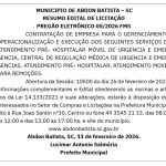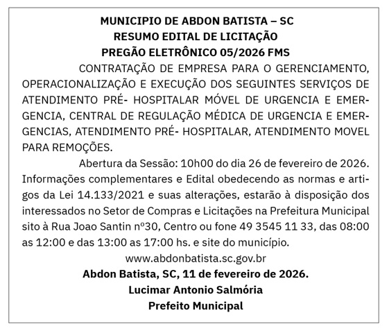 [slideshow_deploy id='63323'] MUNICIPIO DE ABDON BATISTA/SC – LICITAÇÃO – PREGÃO 05/2026 FMS By Redação 11 fevereiro, 2026 FacebookTwitterPinterestWhatsApp Mais lidas na semana Comunidade Santa Catarina tem segundo maior crescimento do varejo do país 20 abril, 2026 0 O desempenho catarinense supera com folga a média nacional,... Destaques Saúde amplia acesso à vacina contra o HPV em Santa Catarina 20 abril, 2026 0 A Secretaria de Estado da Saúde de Santa Catarina... Destaques Sicredi aumenta em 15,7% volume liberado para o agro nos primeiros oito meses da Safra 25/26 20 abril, 2026 0 Instituição financeira cooperativa concedeu R$ 48,3 bilhões até fevereiro... Agronegócio SEMAE e OCESC avançam em cooperação para capacitar técnicos sobre o CAR Digital 20 abril, 2026 0 A proposta prevê que a SEMAE ofereça capacitações específicas... Cultura Festa de São João Batista inicia no dia 13 de junho com tradicional Baile de São João 20 abril, 2026 0 A Paróquia São João Batista de Campos Novos, iniciou... Notícias relacionadas ABDON BATISTA/SC – LICITAÇÃO – PREGÃO 43/2026 MUNICÍPIO DE ABDON BATISTA/SC – LICITAÇÃO – PREGÃO 42/2026 ABDON BATISTA – LICITAÇÃO PREGÃO – 36/2026 MUNICÍPIO DE ABDON BATISTA/SC – LICITAÇÃO – PREGÃO 01/2026 ABDON BATISTA/SC – EDITAL DE LICITAÇÃO – PREGÃO 33/2026 Campos Novos nublado enter location 14.3 ° C 14.3 ° 14.3 ° 79 % 1.8kmh 94 % ter 25 ° qua 23 ° qui 27 ° sex 24 ° sáb 19 ° Pesquisar Categorias Populares Últimas NotíciasDestaquesComunidadeSaúdeAgronegócioOcorrências Campos NovosCotidiano
