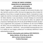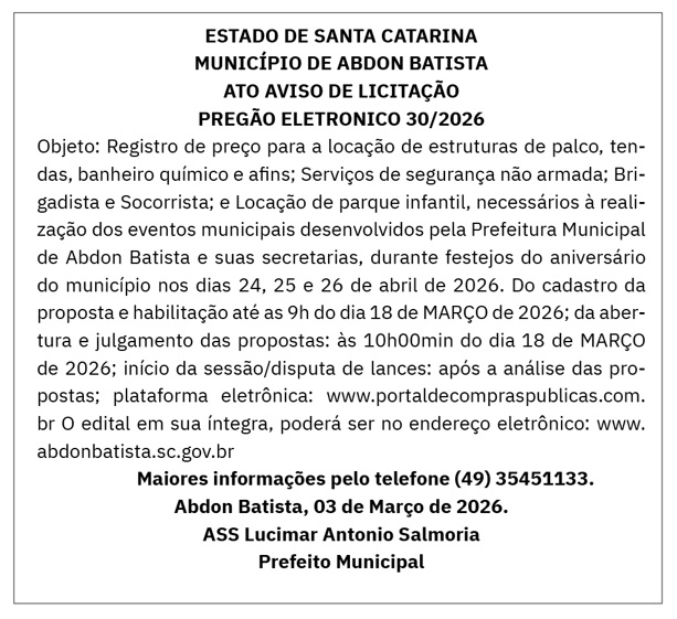 [slideshow_deploy id='63323'] MUNICÍPIO DE ABDON BATISTA – LICITAÇÃO – PREGÃO 30/2026 By Redação 3 março, 2026 FacebookTwitterPinterestWhatsApp Mais lidas na semana Comunidade Santa Catarina tem segundo maior crescimento do varejo do país 20 abril, 2026 0 O desempenho catarinense supera com folga a média nacional,... Destaques Saúde amplia acesso à vacina contra o HPV em Santa Catarina 20 abril, 2026 0 A Secretaria de Estado da Saúde de Santa Catarina... Destaques Sicredi aumenta em 15,7% volume liberado para o agro nos primeiros oito meses da Safra 25/26 20 abril, 2026 0 Instituição financeira cooperativa concedeu R$ 48,3 bilhões até fevereiro... Agronegócio SEMAE e OCESC avançam em cooperação para capacitar técnicos sobre o CAR Digital 20 abril, 2026 0 A proposta prevê que a SEMAE ofereça capacitações específicas... Cultura Festa de São João Batista inicia no dia 13 de junho com tradicional Baile de São João 20 abril, 2026 0 A Paróquia São João Batista de Campos Novos, iniciou... Notícias relacionadas ABDON BATISTA/SC – LICITAÇÃO – PREGÃO 43/2026 MUNICÍPIO DE ABDON BATISTA/SC – LICITAÇÃO – PREGÃO 42/2026 ABDON BATISTA – LICITAÇÃO PREGÃO – 36/2026 MUNICÍPIO DE ABDON BATISTA/SC – LICITAÇÃO – PREGÃO 01/2026 ABDON BATISTA/SC – EDITAL DE LICITAÇÃO – PREGÃO 33/2026 Campos Novos nublado enter location 14.3 ° C 14.3 ° 14.3 ° 79 % 1.8kmh 94 % ter 25 ° qua 23 ° qui 27 ° sex 24 ° sáb 19 ° Pesquisar Categorias Populares Últimas NotíciasDestaquesComunidadeSaúdeAgronegócioOcorrências Campos NovosCotidiano